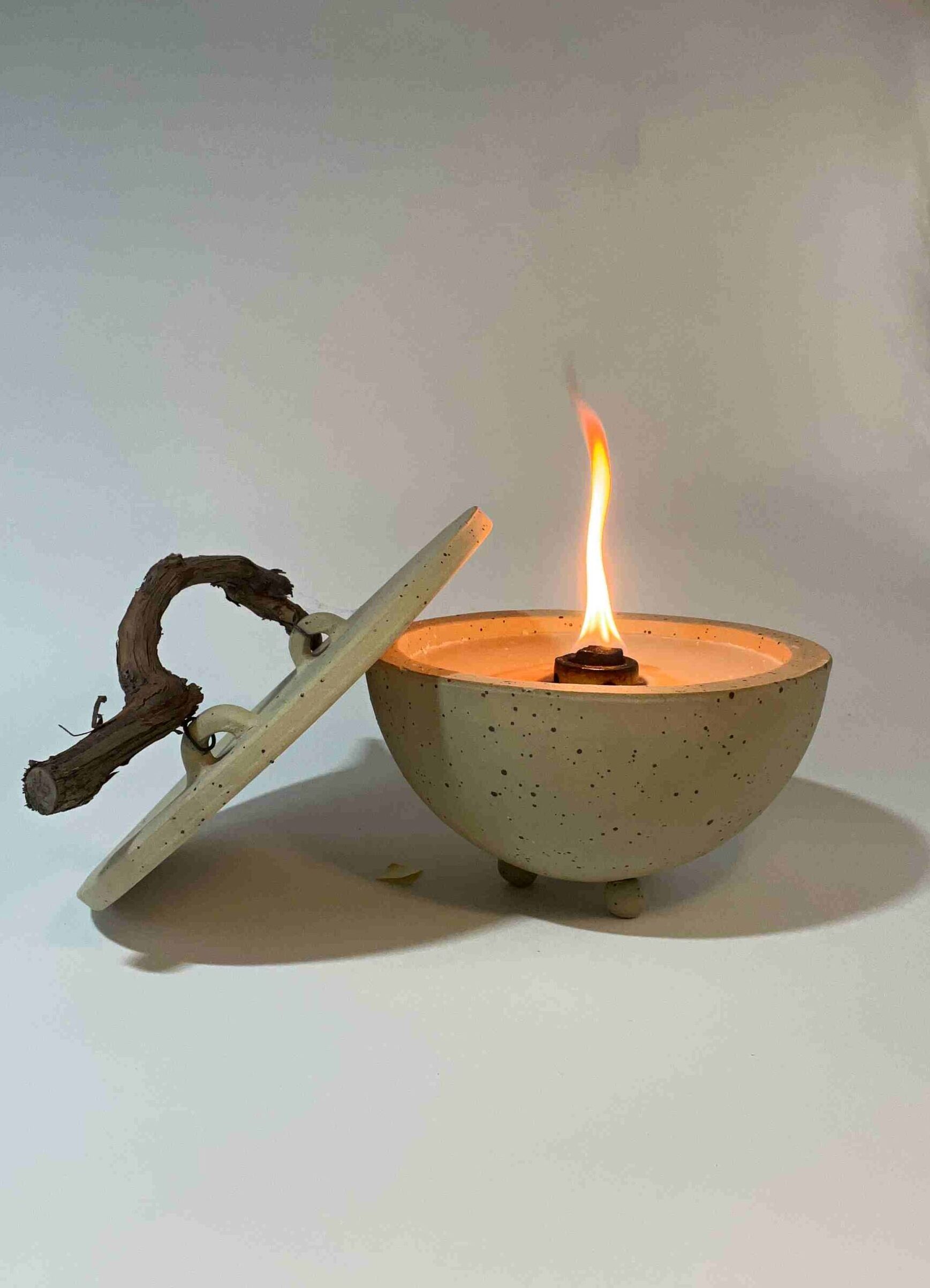 - Deckel mit Weinreben-Griff zum Ablöschen der Flamme